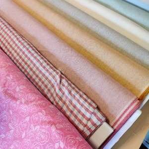 Diverse tinten recycled canvas. En vooraan roze rozen, daarachter een mousseline.